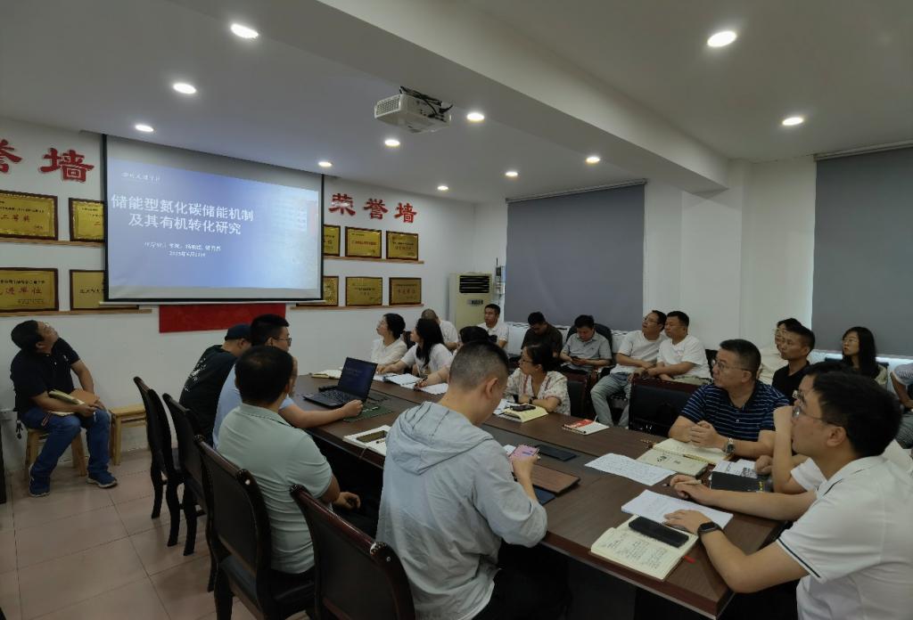杨明成博士以“储能型氮化碳储能机制及其有机转化研究”为题,详细介绍了有机共轭聚合物氮化碳的电子存储机制并扩展了储能材料在”暗“反应环境下的运用场景。着重介绍了不同阳离子储能体系的电子动力学行为以及相应还原机理,同时,杨明成博士利用理论计算分析了电子在不同环境下的储存状态,为深入理解储能材料的电子储存及还原机制提供了新的见解,也为储能型光催化剂的发展提供了有效参考。与会教师围绕报告主题展开了深入而富有成效的探讨。